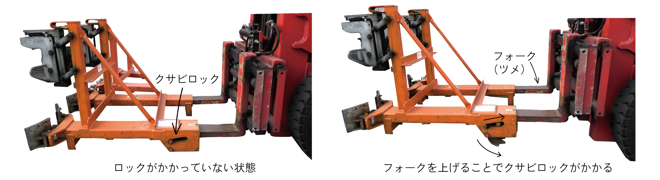 ドラムクリッパー自体はフォークリフトの爪を挿し込んで固定されています。2本用ではクサビロックと呼ばれる脱落防止機能が付いており、爪やクサビ状のロック機能がリンクすることにより、しっかりと固定されます。ただし設計上フォークリフトの爪の厚さが40㎜と規定されているので、その辺りの確認も必要なポイントになります。