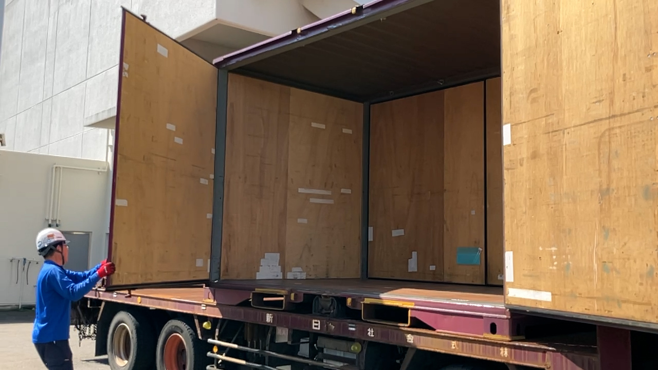 日新の羽沢営業所では、食品関連の品物を多く扱っているため、コンテナ内部の状態には常に細心の注意を払っています。 お客様に空コンテナを配送する前には、細かな部分まで清掃を行い、養生紙を敷き詰めるといった細やかな作業を欠かしません。こうした徹底した衛生管理と荷物を守るという意識が、今回のデリケートな展示品輸送にも活かされています。