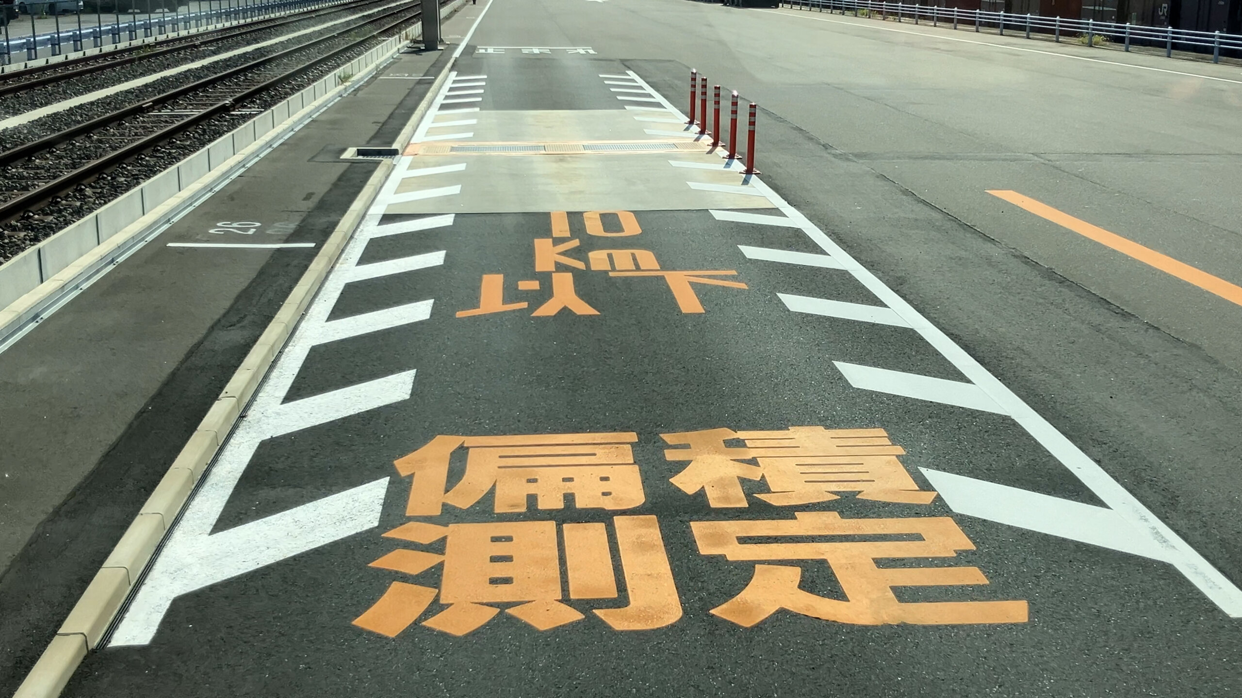 構内を走行するトラックが必ず通過するのが、「偏積測定」と呼ばれる、自動で偏荷重をチェックする機械です。これは、コンテナ内の積み付けバランス(前後左右の偏り)を自動で測定するシステムで、少しでもバランスが悪いと赤信号が点灯し、積み直しが必要となります。鉄道輸送の安全運行を根幹から支える厳格なチェックですが、私たちのコンテナは問題なく青信号でクリアし、コンテナホームへと進むことができました。