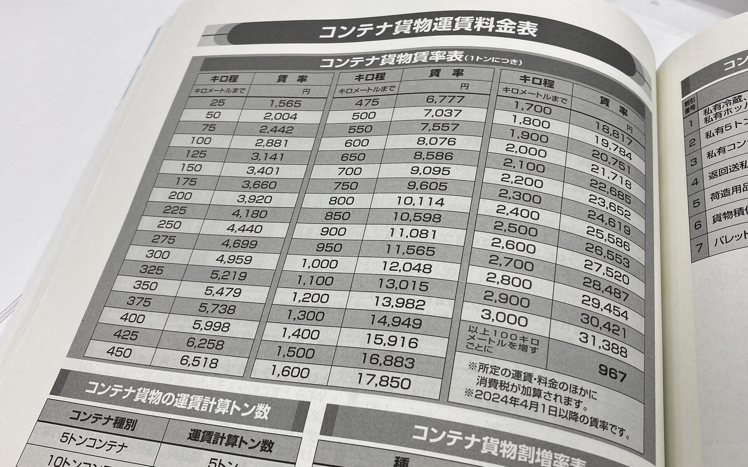 コンテナ貨物賃率(運賃) ¥13,982(1トンたり、1,200kmまで、消費税別途)