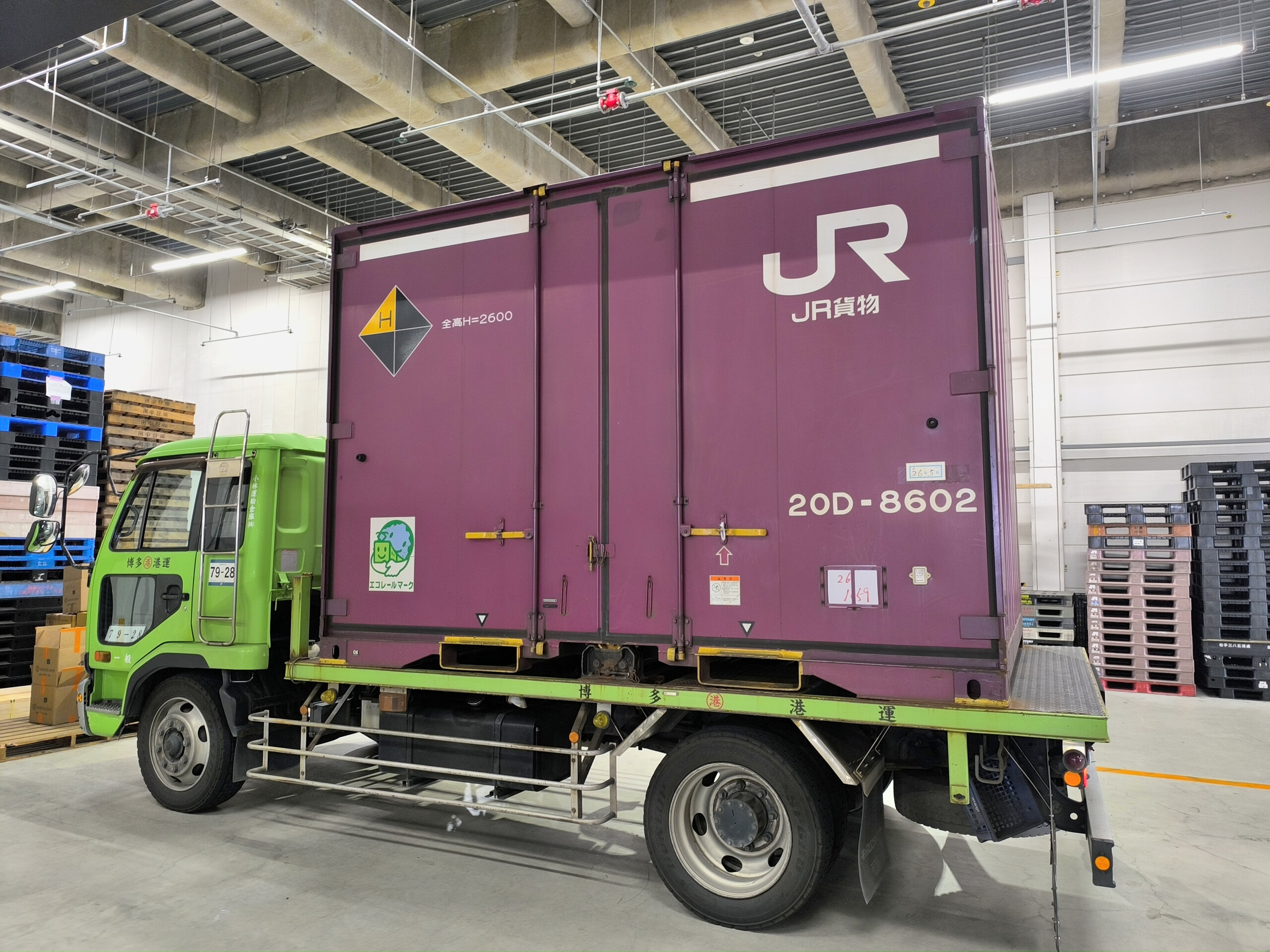 今回の輸送のため、まずは横浜市内の新興倉庫に荷物を集約。貨物専用の横浜羽沢駅構内に位置する羽沢営業所に依頼して鉄道輸送の手配と同時に、横浜・福岡での集配送のトラック手配も依頼しました。集荷に駆けつけてくれたのは、羽沢営業所所属の萩原さん。ドライバー歴30年近い大ベテランです。萩原さんの仕事は、単にコンテナを輸送するだけではありません。コンテナへの積み付け、荷下ろしまでを担当範囲としています。現代の鉄道貨物輸送はコンテナが主体となりますが、最寄駅からの集荷・配送を含めた一貫輸送が一般的です。品物の性質によっては、バラ積みにも対応する、きめ細やかな対応が可能となっています。