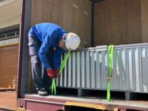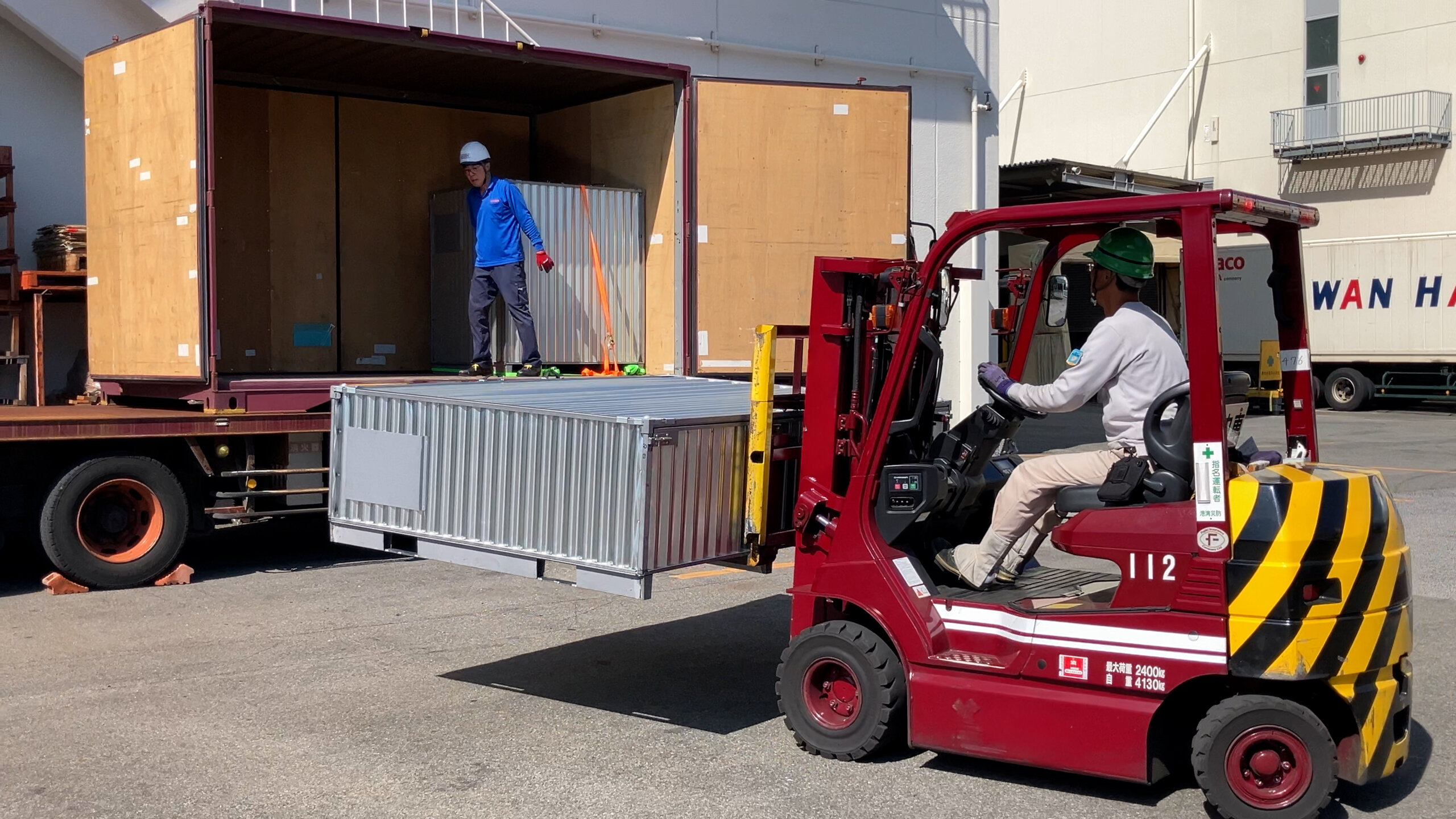 今回の荷物は、リチウムイオン電池の静脈物流ソリューション LiBerth(リバース)の専用金属製容器 LiB ボックス A・B typeと、展示会用の事務用品・備品でした。 現場では、フォークリフトでLiBボックスをコンテナ内に積み込みました。異なる形状の荷物をコンテナ内で安定させるには熟練の技術が必要です。積込後、輸送中の安全のため、固縛用のベルトをかけてしっかりと固定する作業も行いました。特に展示品ということで、ベルトが品物を傷付けないように、養生を行うなど、安全・確実な長距離輸送を行うべく、細心の注意が払われました。