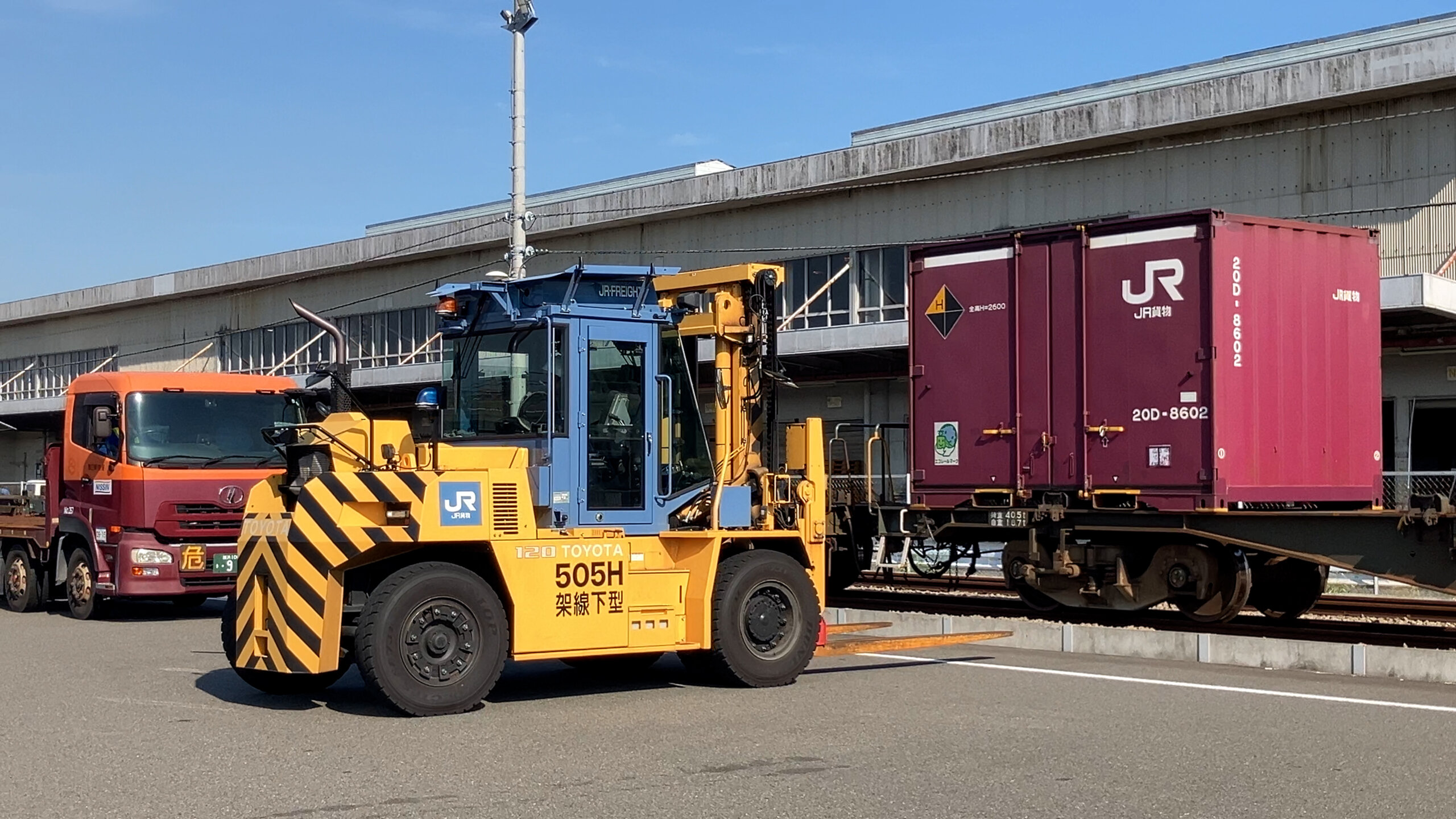 受付データはすぐにフォークリフトのオペレーターに共有され、私たちのトラックが指定位置に向かうと、オペレーターが既に待ち構えているという迅速な連携体制。フォークリフトによってスムースに、福岡貨物ターミナル行き・1059列車へと積み込まれました。