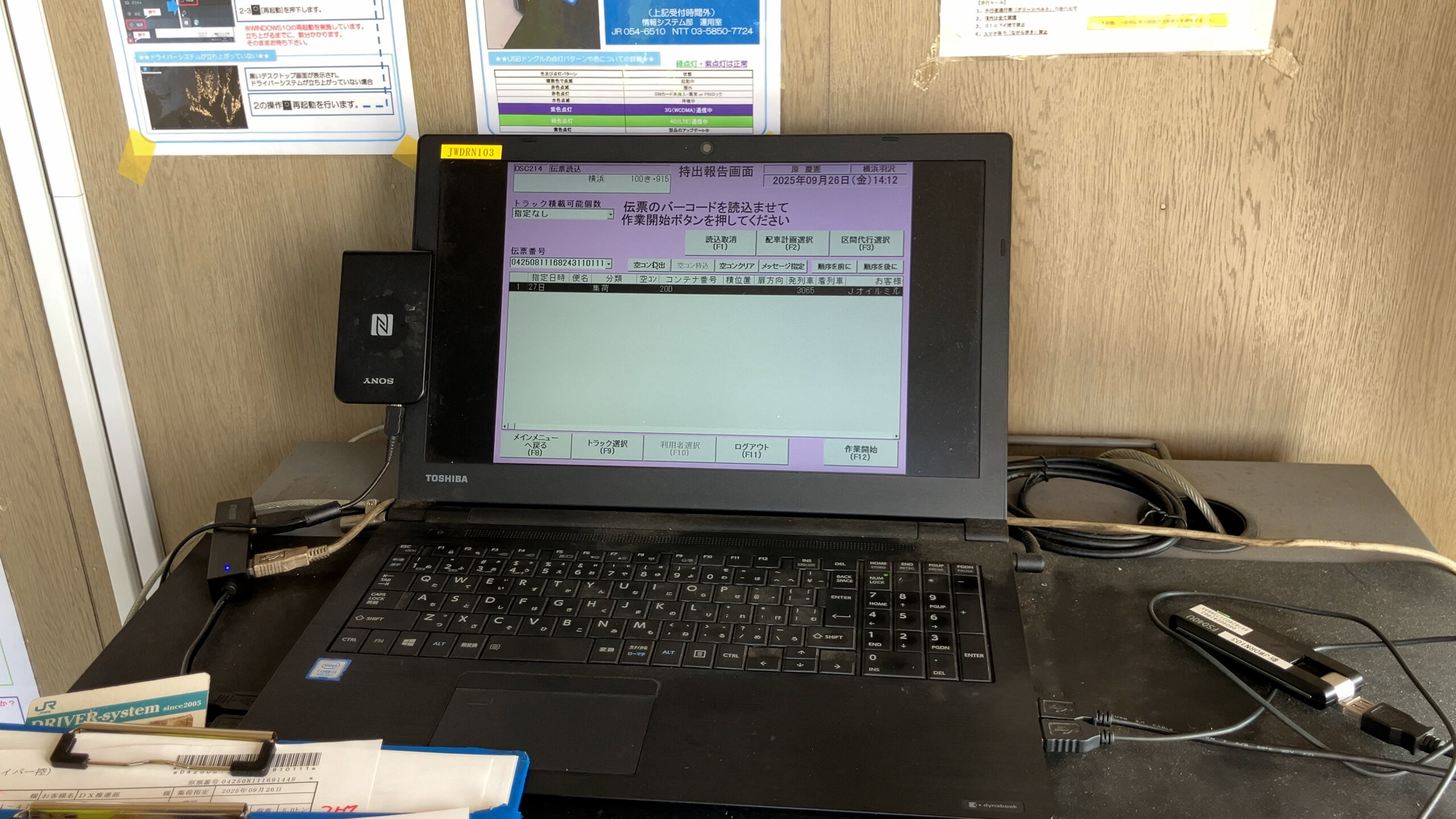 構内に入ると、そこには15km/h厳守、基本的に一方通行というルールで、それに従いトラックを進めます。まず最初にJR貨物の受付所へ移動。ここでは、各種情報をPC端末で入力・確認を行います。具体的には集荷伝票のバーコードを読み取ると、コンテナ番号や封印環番号などの固有情報が掲示され、画面の指示に従って確認を進めます。このデジタル化された手続きによって、構内のどこにコンテナを搬入すべきか、行き先別・列車別に整理された指示が瞬時にドライバーへ伝えられます。