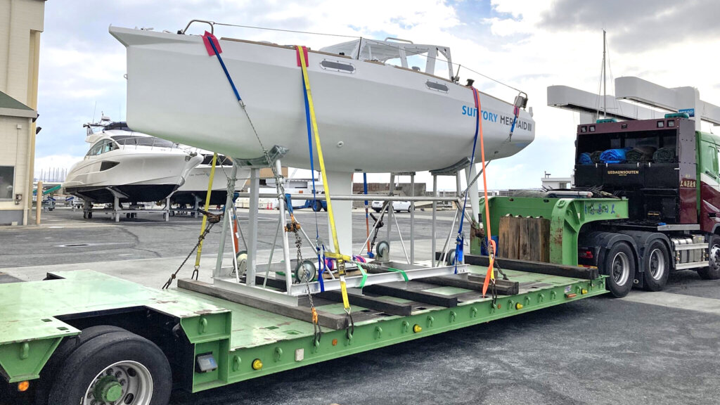 2022年1月24日、新西宮ヨットハーバーにあったサントリーマーメイドⅢ号(全長6m、高さ3.15m、重さ1.5t)を低床トレーラーにて引取りを実施し、神戸港に搬入しました。