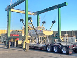 低床トレーラーを用いて慎重にヨットを輸送