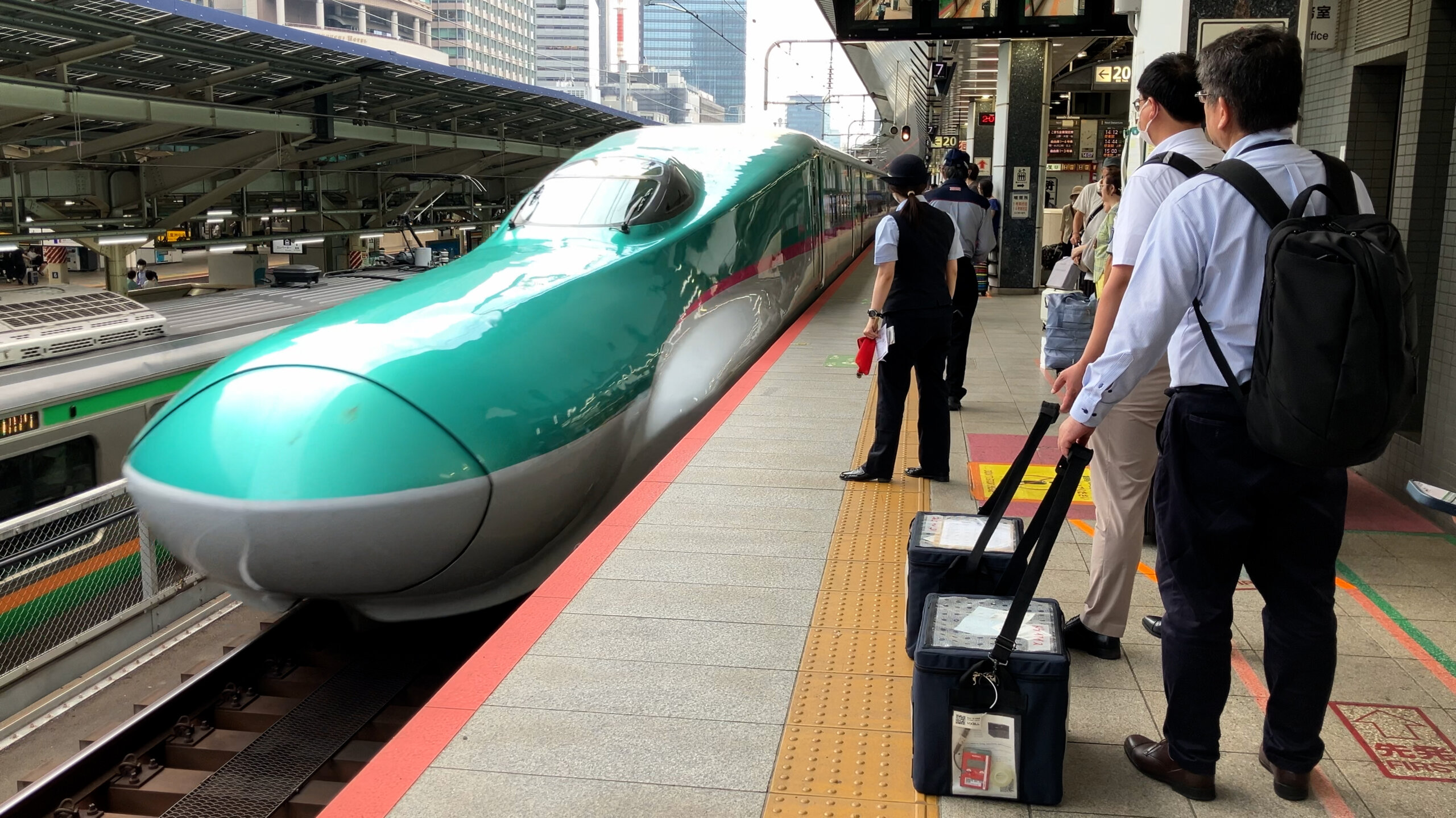 輸送ルートは、千代田化工建設(最寄:新子安駅)を出発し、東京駅を経由して新青森駅へ。そして再び東京駅に戻り、新子安駅へ帰着する約1,400kmほどの往復ルートです。往路の新子安駅から新青森駅まで、担当者が容器をハンドキャリーで輸送しました。