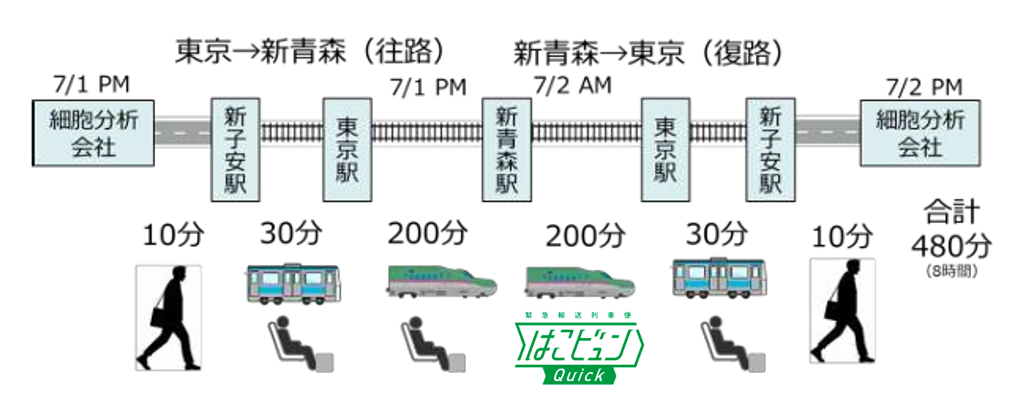輸送時間 新幹線利用時の所要時間 約4時間30分(トラック輸送:8-10時間) 大幅な時間短縮により温度逸脱リスクを最小化。治験薬・検体輸送における信頼性向上を実証