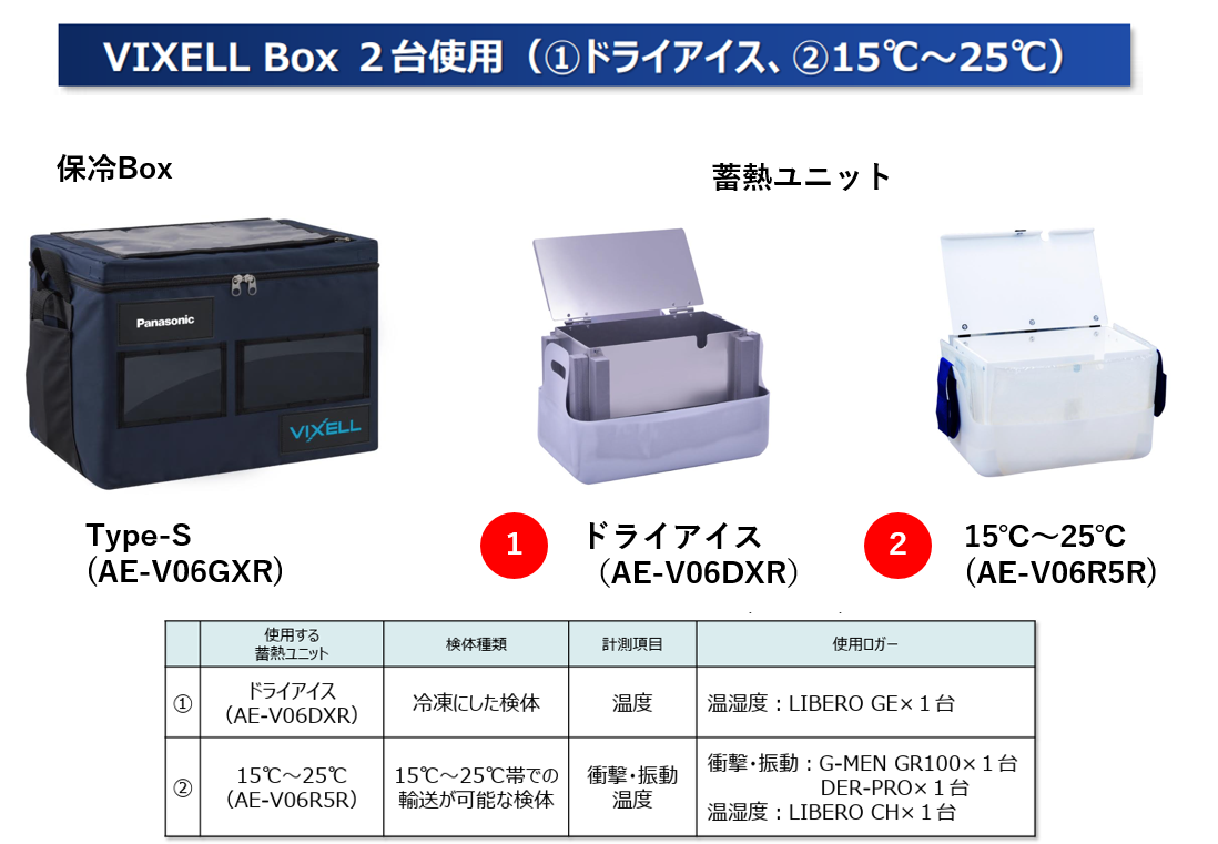 2025年7月1日(火)から2日(水)にかけて実施された本実験では、パナソニックの真空断熱保冷容器「VIXELL Box2箱を使用しました。一つはドライアイスで超低温(-79℃対応)、もう一つは15℃~25℃の定温に設定し、それぞれにヒト骨髄由来間葉系間質細胞(MSC)を搭載。MSCは再生医療分野で注目されるデリケートな細胞であり、その品質維持が極めて重要です。