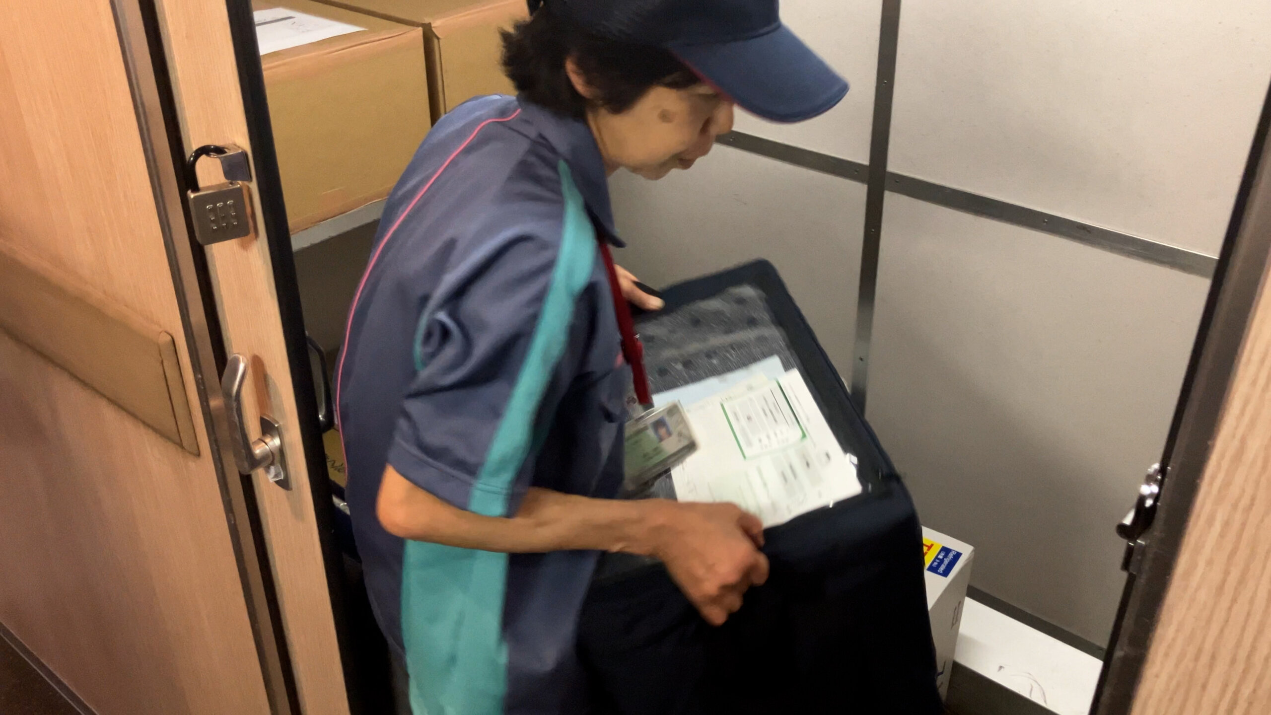 到着後、すぐに荷下ろしが始まる 車内から荷物が下ろされる 業務用エレベーターで移動